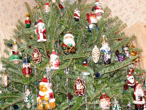 There are over 150 mouth blown glass ornaments on this tree. Santas, Snowmen, Wooden